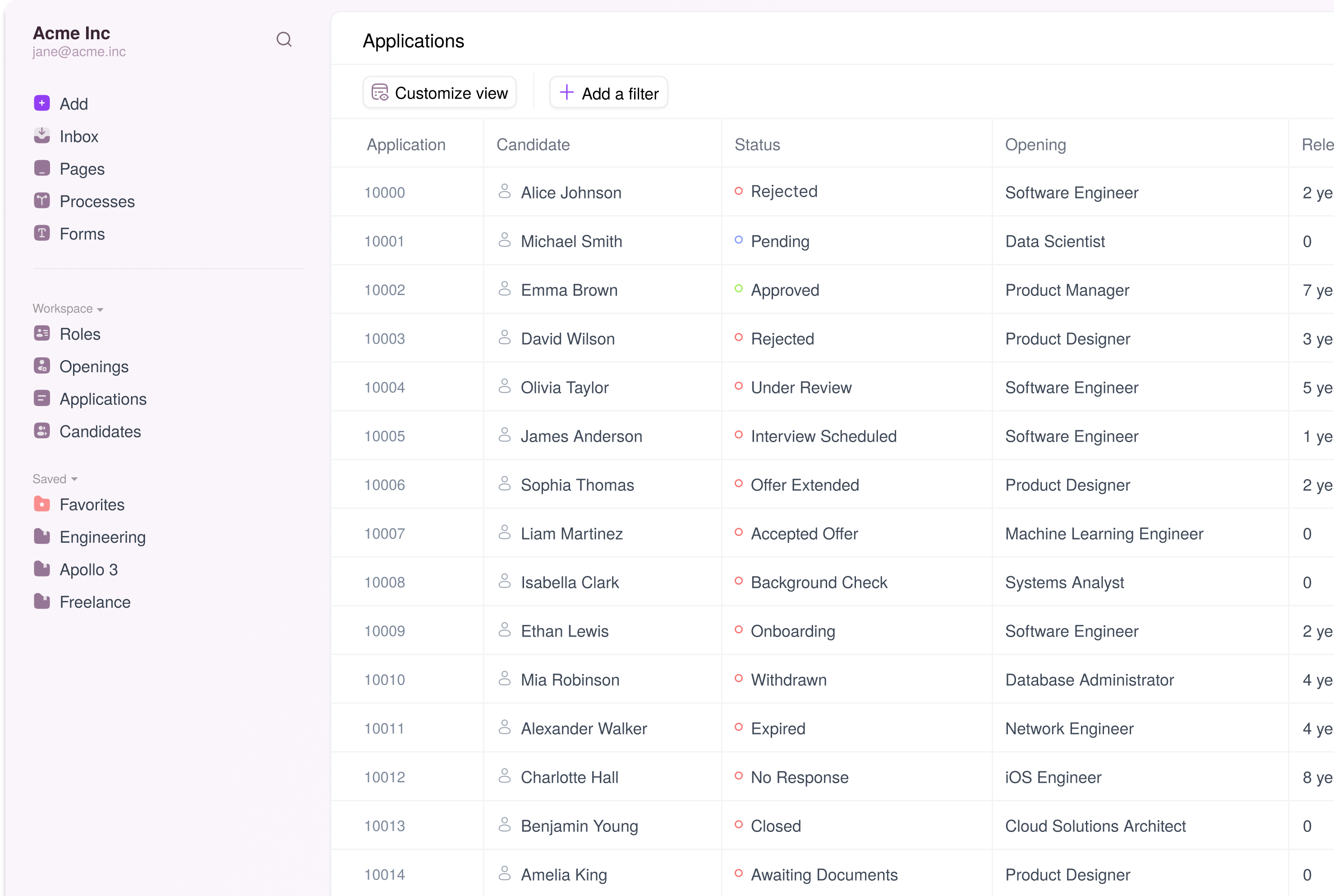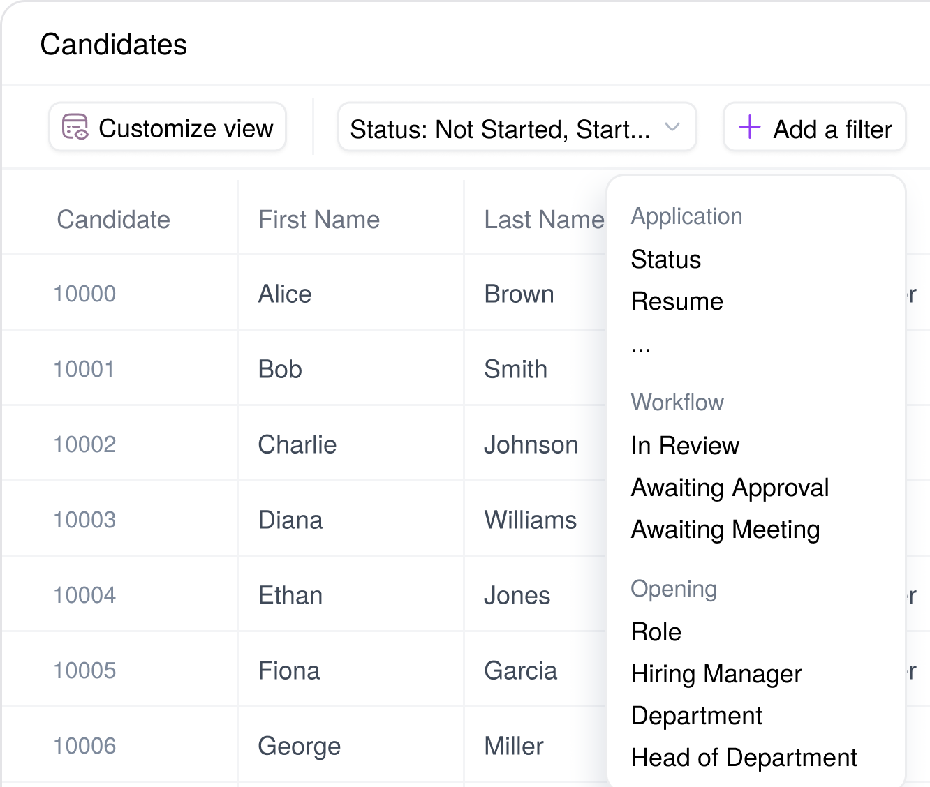 Zero in on the right candidates with powerful filters across custom fields, applications, and candidate attributes.