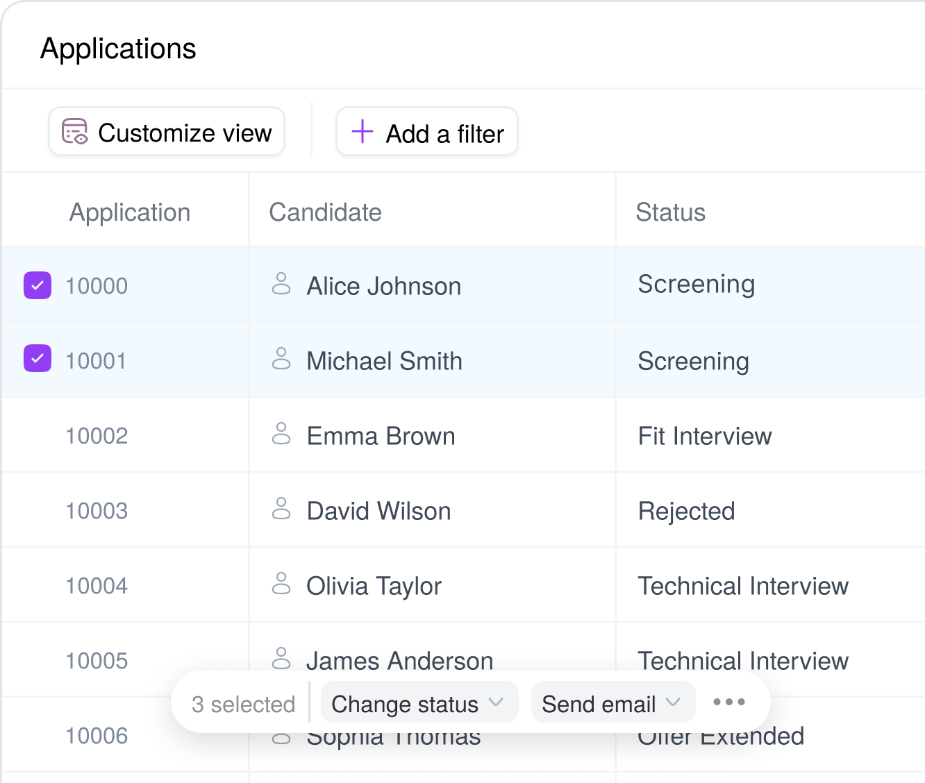 Manage multiple candidates simultaneously with bulk status updates, email sends, and workflow transitions.